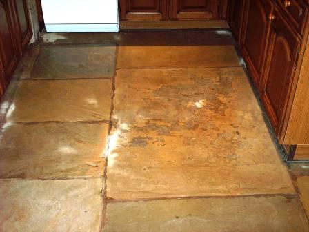 One of the biggest problems we find with stone flooring in a kitchen is that the sealer applied is stripped away by the continuous use of cleaning agents not designed for this type of surface.